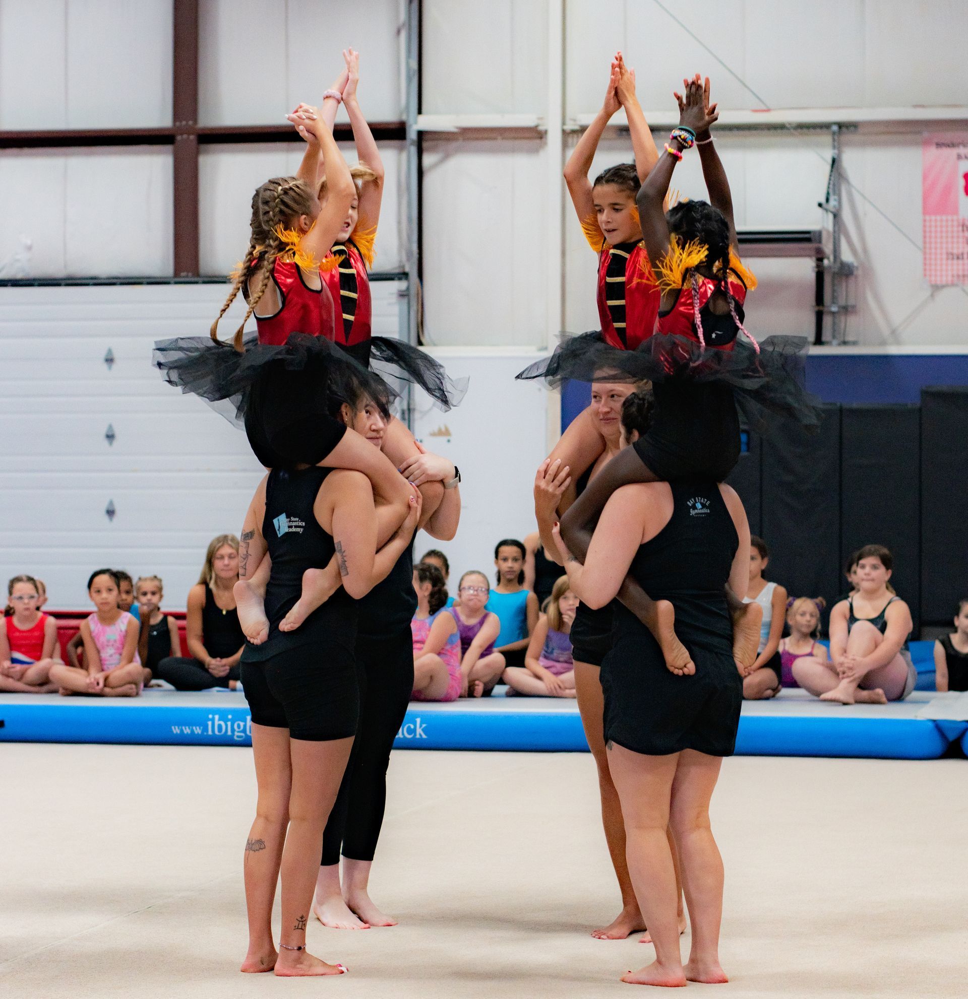 Three Peas work on forward rolls, straddle rolls, and Three Pea cartwheels. They increase their balance with beam work that includes alternating forward kicks, squat holds, relevé walks and beam crawls. Three Peas develop core strength by learning to draw to a tuck from a straight hang on the bars and execute forward rolls over the bar. Their vault skills include punching the board with both feet, a squat on to a block and donkey kicks.