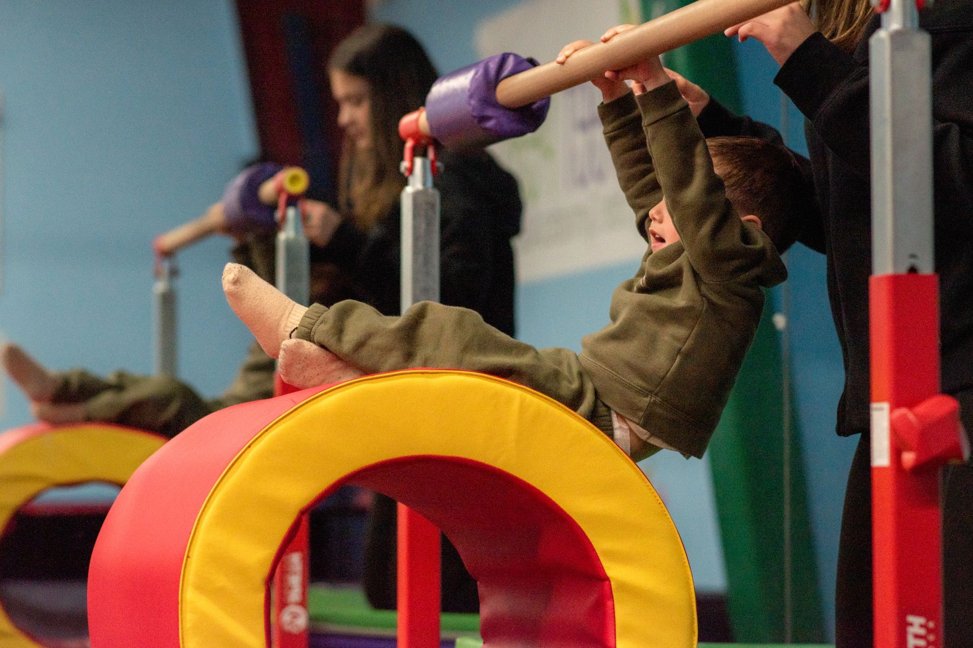 The Independent Two Peas class is designed for our two-year-old students who have confidently mastered the foundational skills of our Two Peas curriculum and are ready for the next step. With parents present for support, the students are encouraged to participate independently in a structured, yet playful environment. This class builds on age-appropriate gymnastics skills while introducing new challenges to support continued growth in strength, coordination, and confidence.